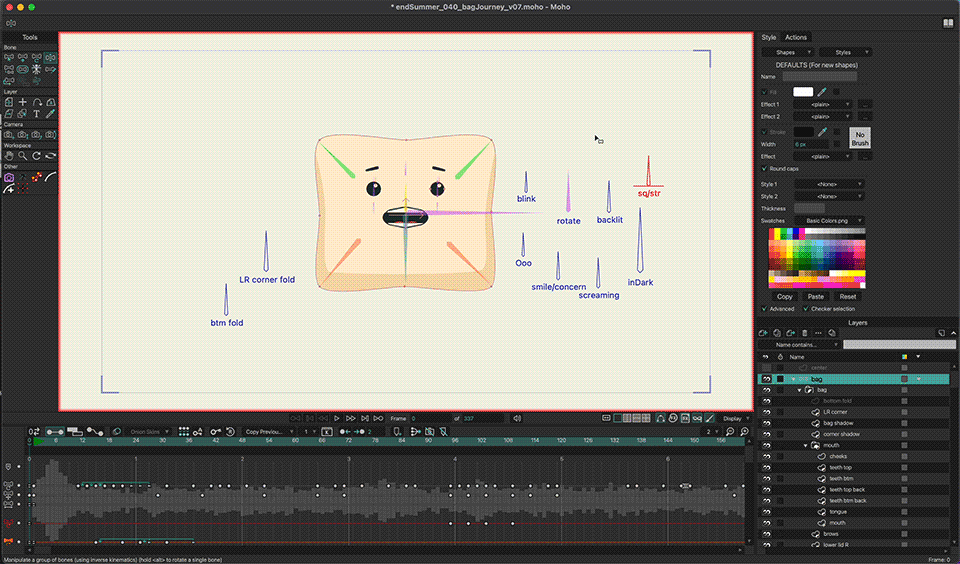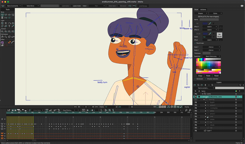 The approach to animation was super hybrid in nature. We used Procreate for rough frame-by-frame (cel animation) sections and Moho for both rigging and cel clean up.