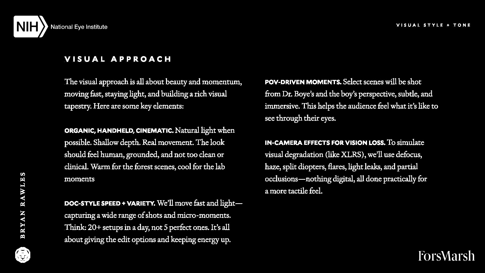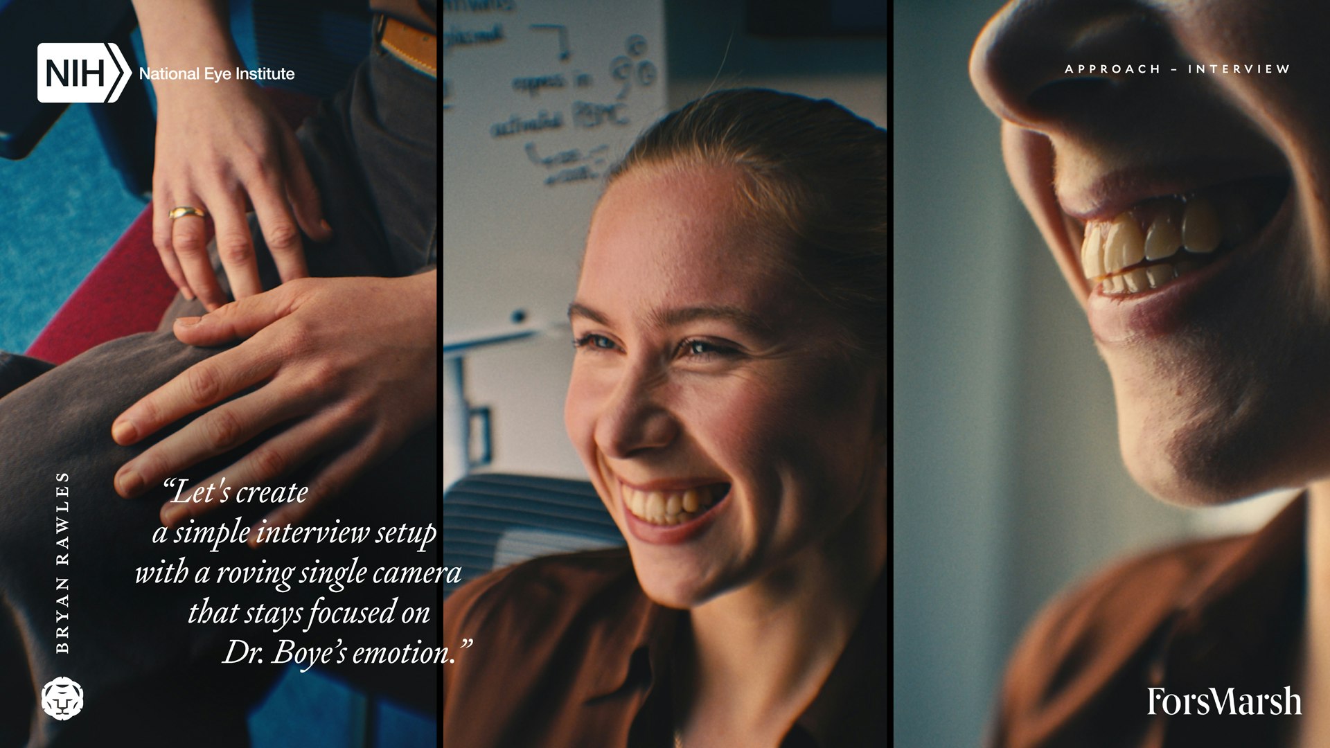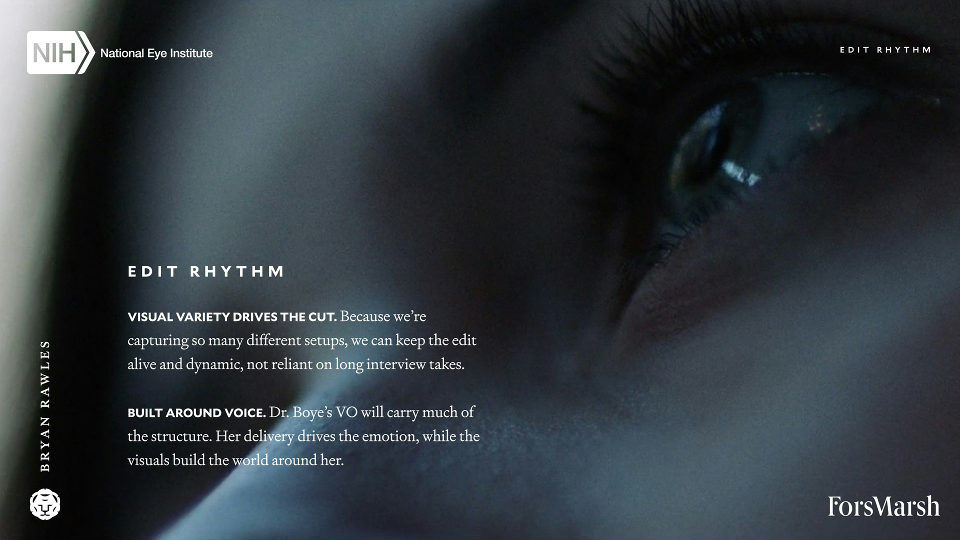 Here's a behind-the-curtains look at a recent creative treatment and collaboration with Fors Marsh and the National Eye Institute. A few conceptual directions were presented, however, we're showcasing the one that made it to production and the edit suite for comparison to the final result which you can find here.