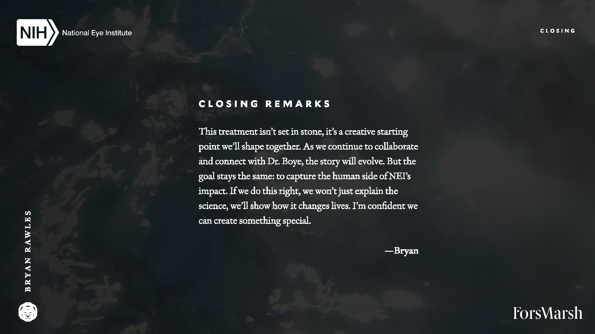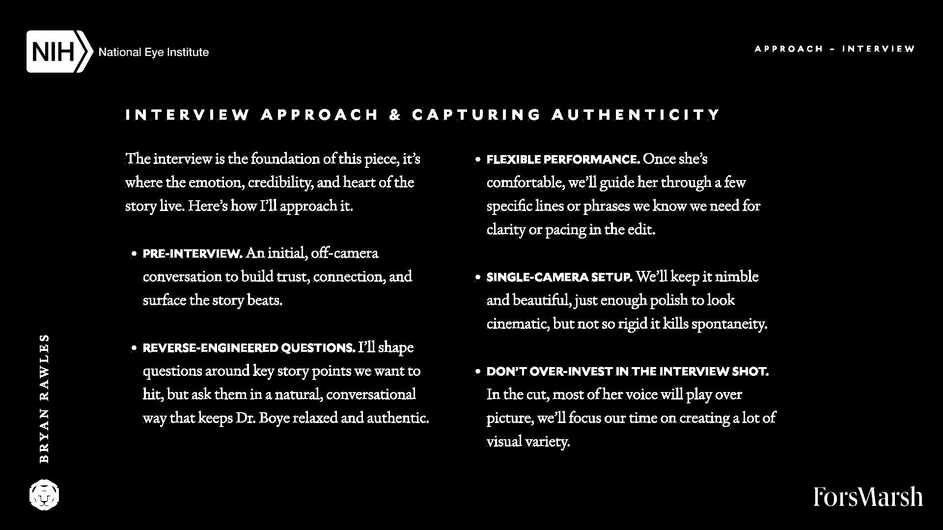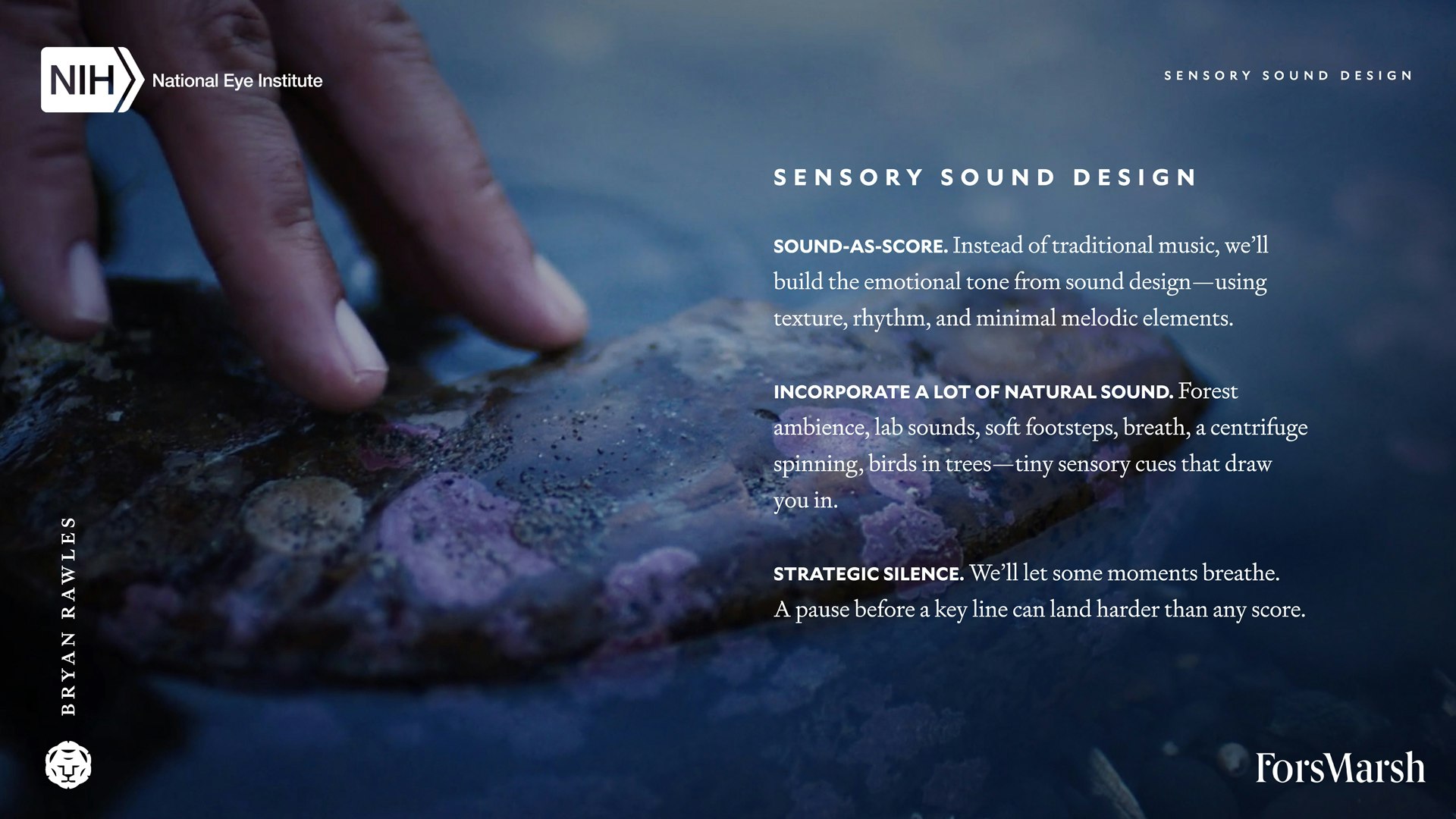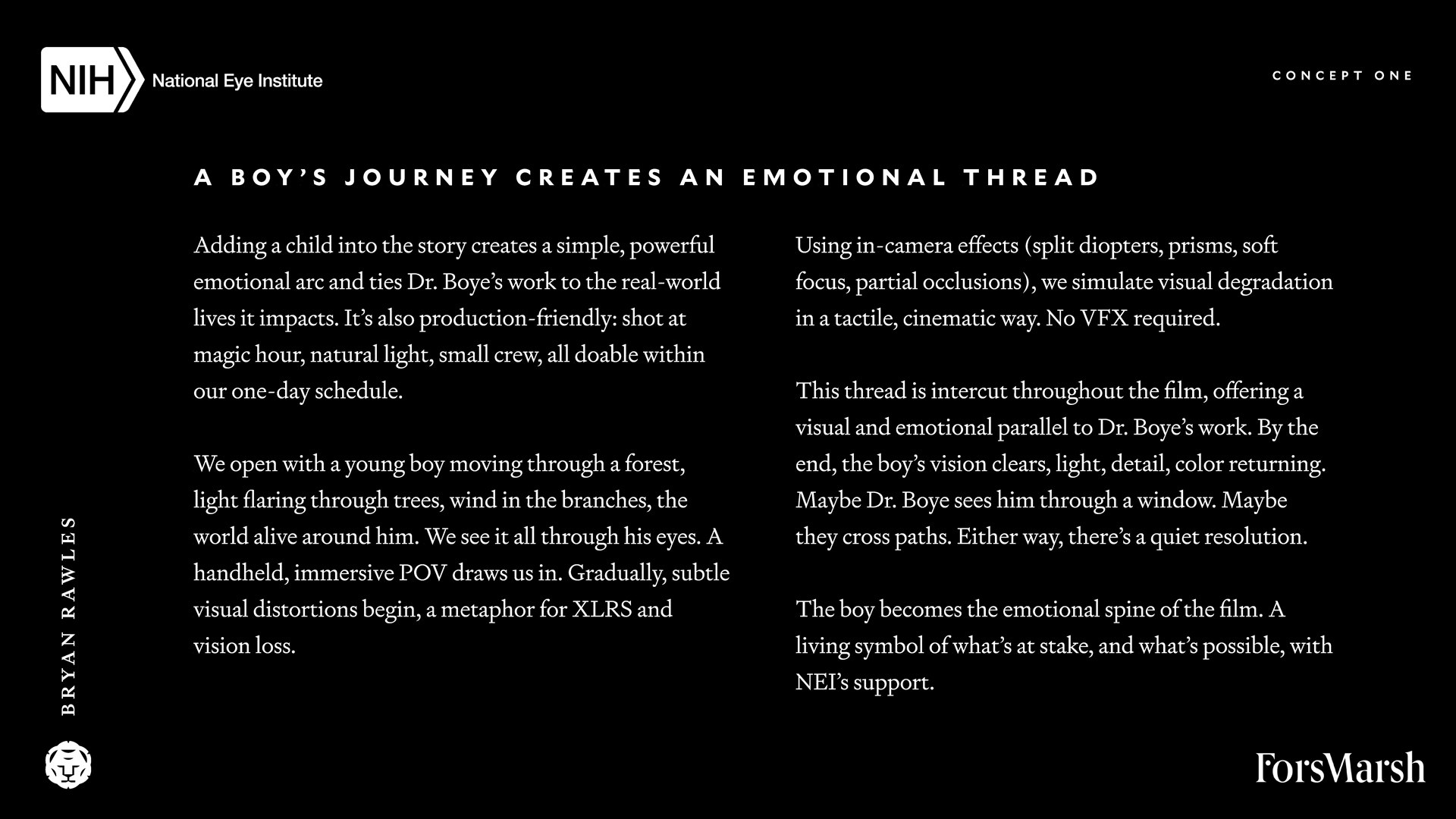 Here's a behind-the-curtains look at a recent creative treatment and collaboration with Fors Marsh and the National Eye Institute. A few conceptual directions were presented, however, we're showcasing the one that made it to production and the edit suite for comparison to the final result which you can find here.